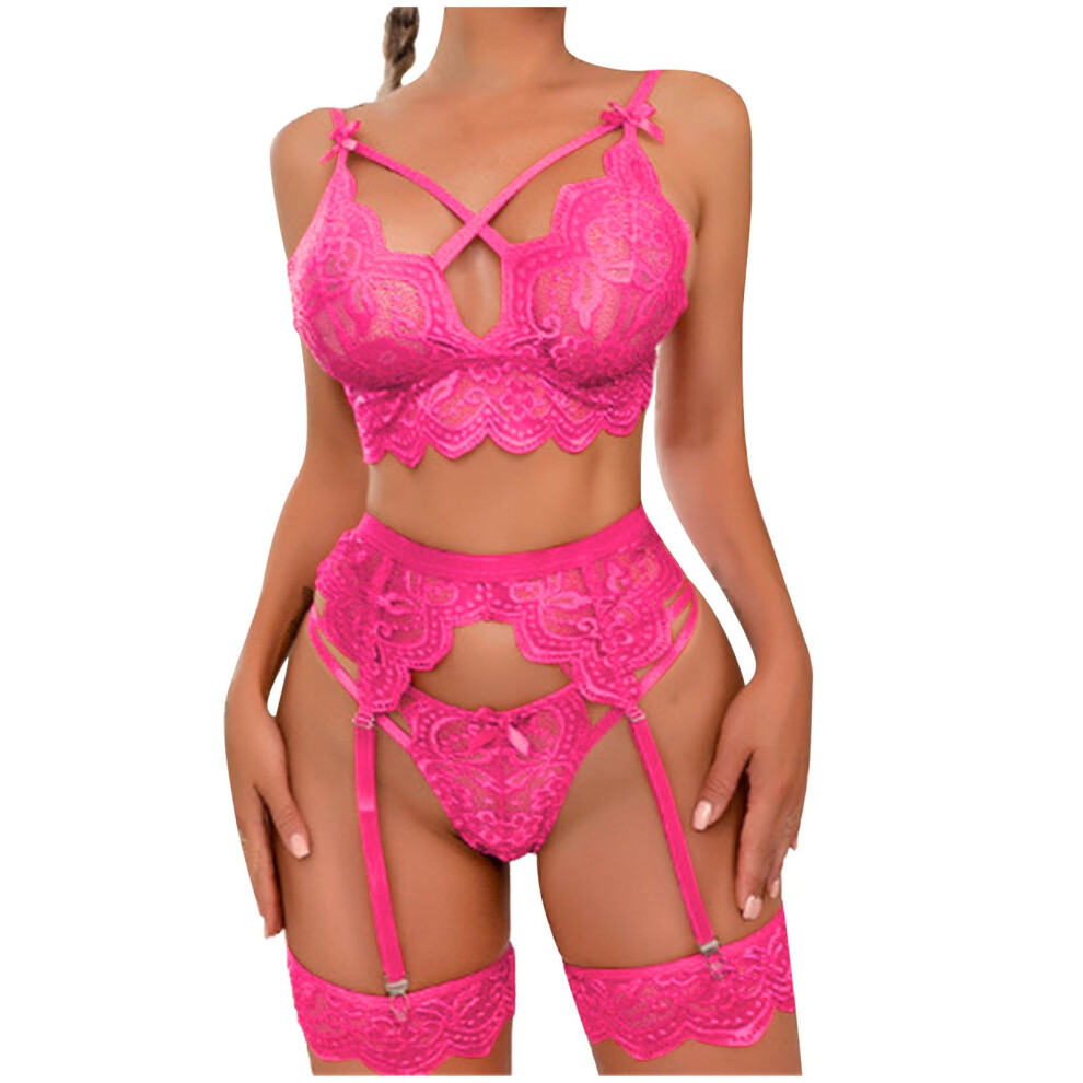 Women's Lace Garter Belt Set 3PCS â Valentine's Day Sexy Lingerie with Bowknot, Hot Pink, Compatible with Standard Sizes