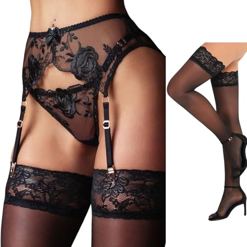 ROSVAJFY Women's Sexy Garter Belt Thong Stockings Set Lace Suspenders Set See Through Mesh Lingerie Sets Valentine's Day Underwear (Black, S)