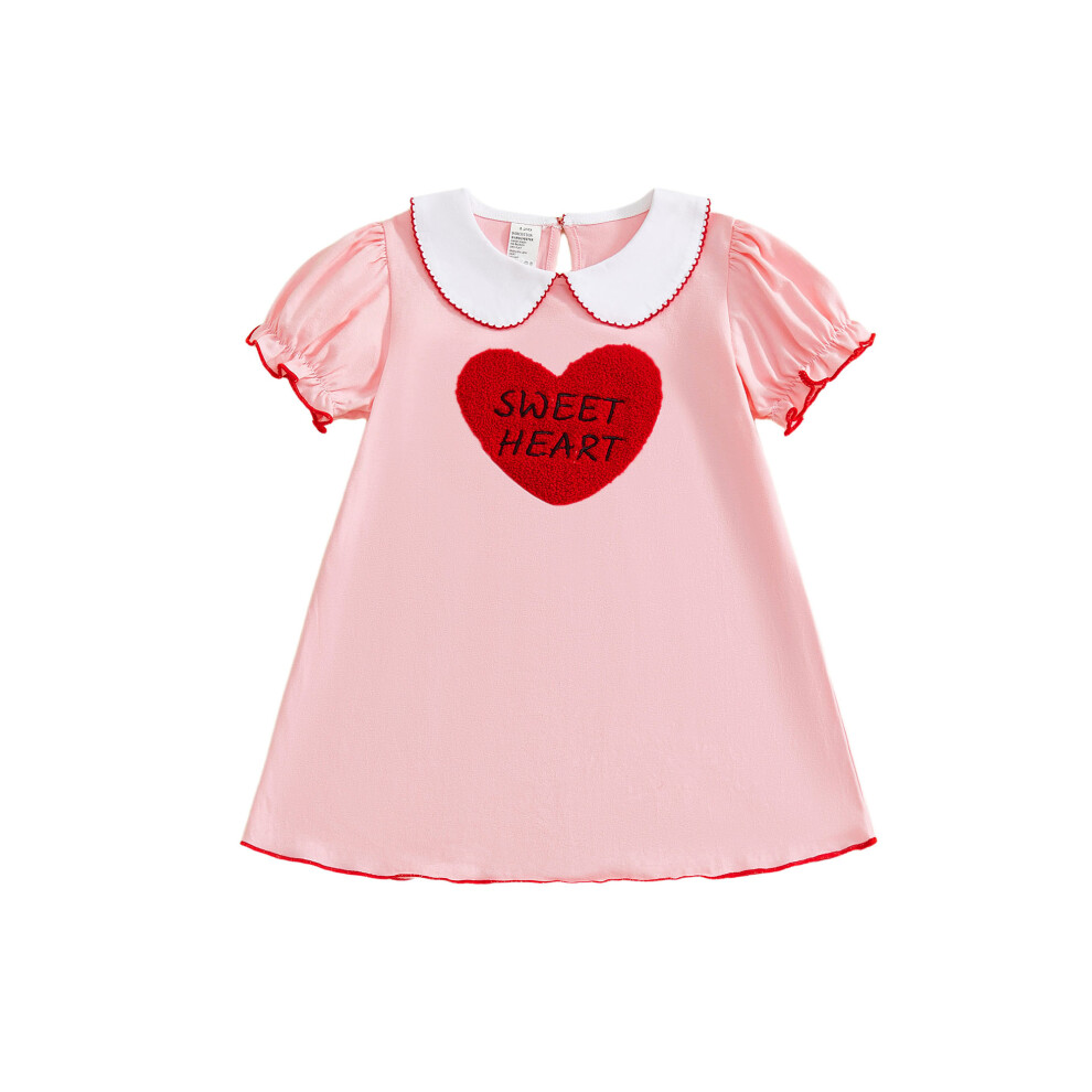 (6-7 Years, Pink) Toddler Little Girl Valentines Dress Heart Letter Embroidered Short Sleeve Doll Collar Dress Cute Spring Clothes