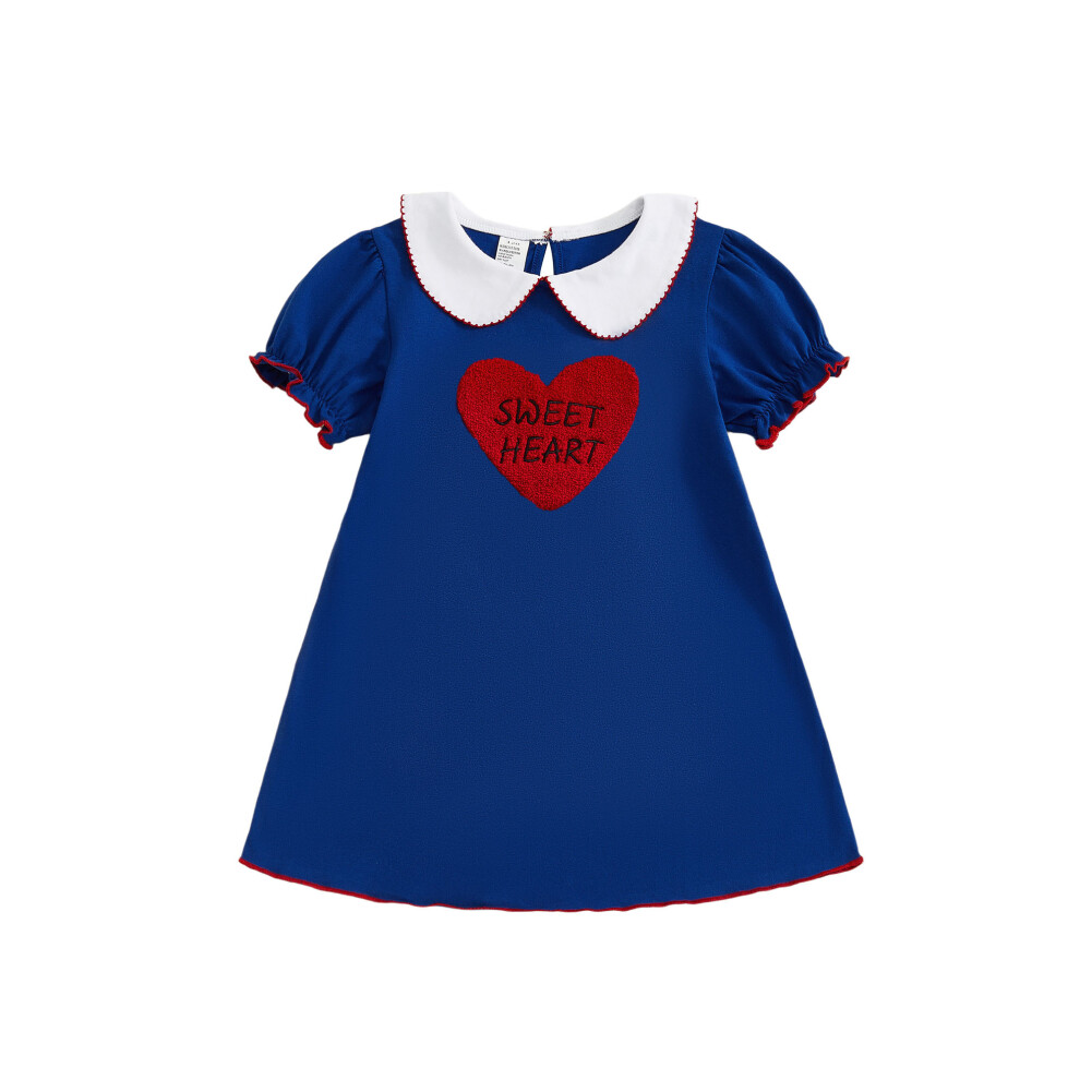 (3-4 Years, Blue) Toddler Little Girl Valentines Dress Heart Letter Embroidered Short Sleeve Doll Collar Dress Cute Spring Clothes