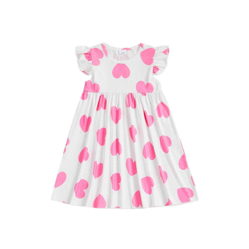 (3-4 Years, Pink) Toddler Little Girl Valentines Dress Heart Print Flying Sleeve A-line Princess Dress Cute Spring Clothes