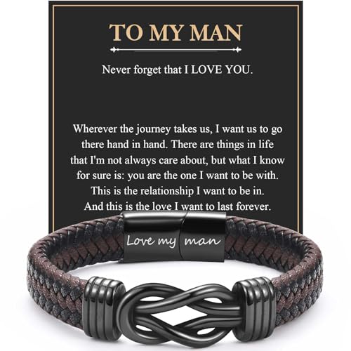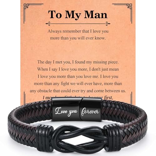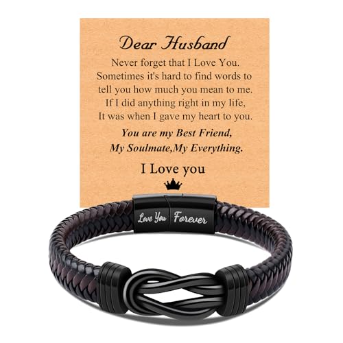 CheersLife Valentines Day Gift for Him Mens Leather Bracelet Anniversary Birthday Gift for Him Husband from Wife, Husband Unique Gifts Knot Bracelet for Men, To My Man Bracelet Love You Forever