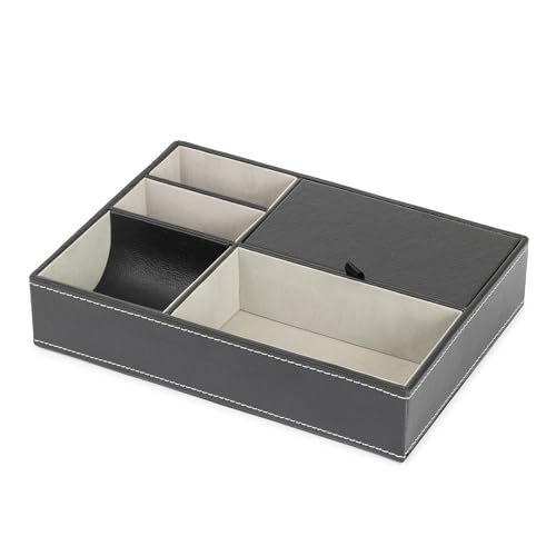 LIVIVO Deluxe 5 Compartment Valet Organiser Tray - Black Textured Leather Faux Suede Lined Mens Jewellery Storage Box with Hinged Lid - Ideal Valentines Gift for Him (Grey)