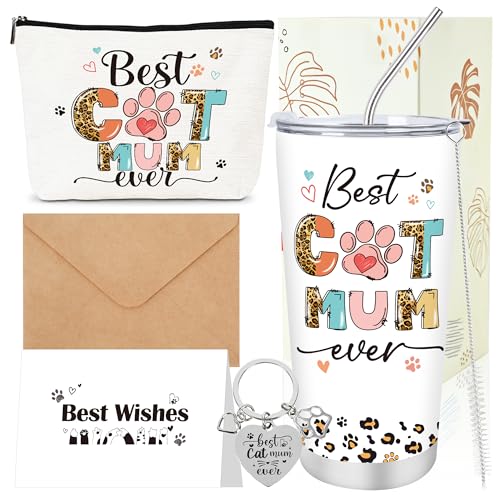 Eiapadeor Cat Lovers Gifts Set - 5 Pcs Cat Mum Gift Travel Mug with Lid Straw Flower Makeup Bag Card with Keyring for Animal Lovers Mum Mother Wife Women for Christmas Birthday Valentines Mothers Day