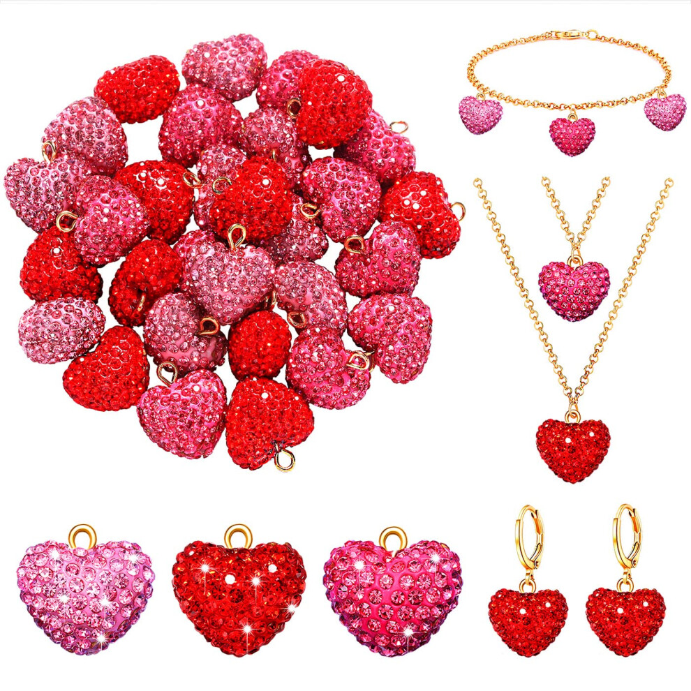 CEALXHENY 30 Pieces Valentines Day Heart Charms for Jewelry Making Red Pink Rhinestone Heart Charms Pendants for DIY Valentines Necklace Bracelet Ear