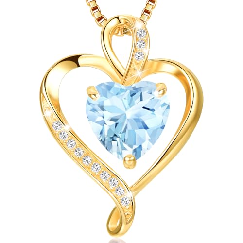 LAVUMO Heart Necklace for Women Real 925 Sterling Silver Love Cubic Zirconia Pendant Brithstone Necklace Valentines Birthday Jewellery Gifts for Women Wife (Gold-03-Created Aquamarine)