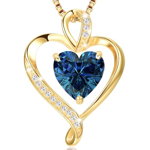 LAVUMO Heart Necklace for Women Real 925 Sterling Silver Love Cubic Zirconia Pendant Brithstone Necklace Valentines Birthday Jewellery Gifts for Women Wife (Gold-09-Created Sapphire)