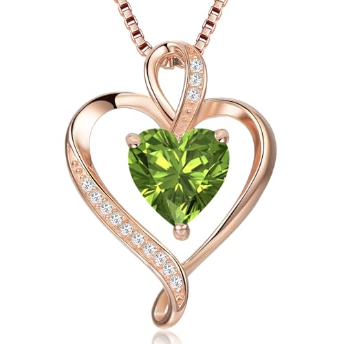 LAVUMO Heart Necklace for Women Real 925 Sterling Silver Love Cubic Zirconia Pendant Brithstone Necklace Valentines Birthday Jewellery Gifts for Women Wife (Rose Gold-08-Peridot)