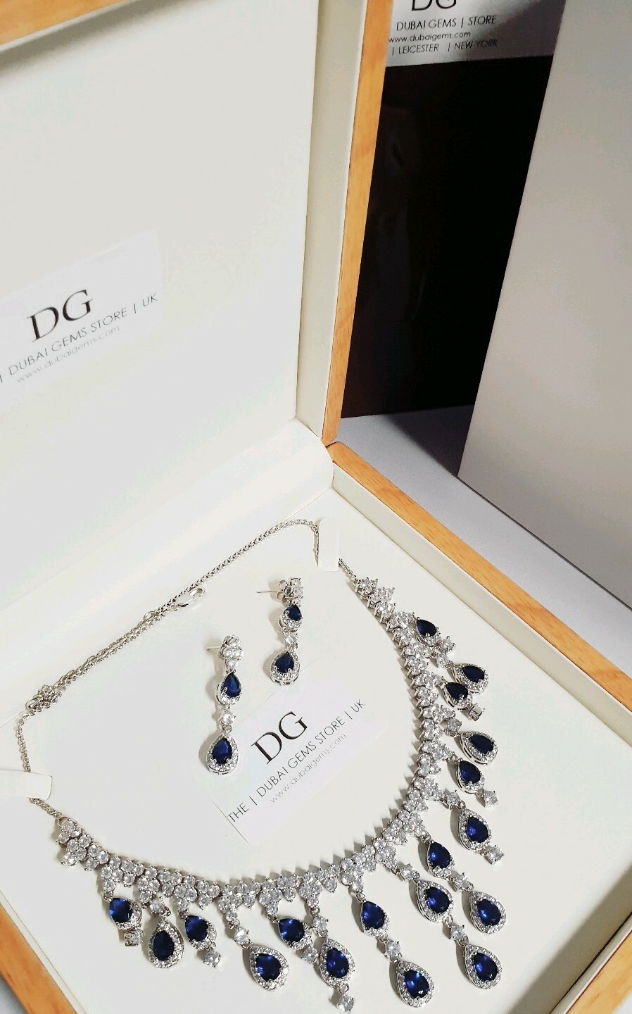 White gold finish pearcut sapphire and created diamond necklace valentines set