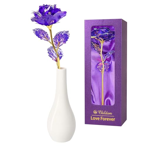 Childom Birthday Gifts for Women,Christmas Rose Gifts For Women Her Mum,Purple Rose Flower With Vase,Valentines Present,Purple Flowers for Grandma Wife Girl Anniversary Christmas Wedding Engagement