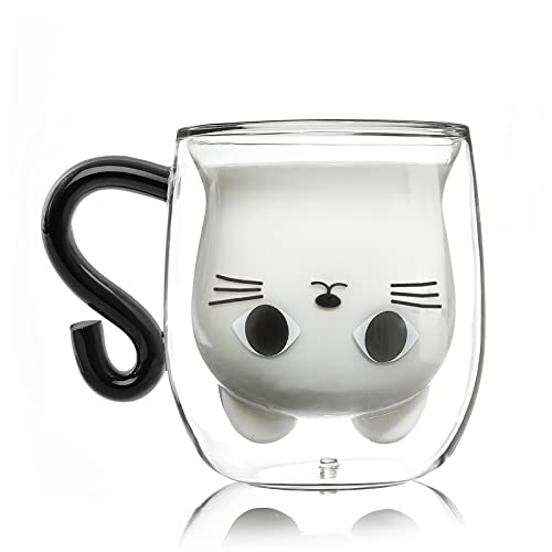 Qinhai Cat Mugs, Cute Double Wall Glass Coffee Tea Cup, Gifts for Birthday Valentines Mothers Day Easter Christmas, Women Wife Mum Her Grandma Girl Teacher Friend Present Idea