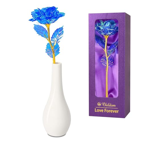 Childom Birthday Gifts for Women,Christmas Rose Gifts For Women Her Mum,Blue Rose Flower With Vase,Valentines Present,Purple Flowers for Grandma Wife Girl Anniversary Christmas Wedding Engagement