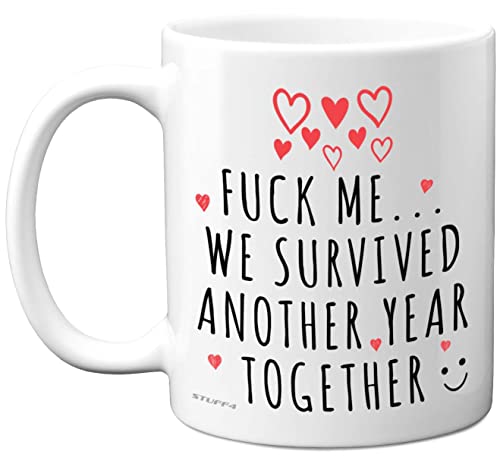 Stuff4 Cute Mug for Him Her - F**k Me We Survived Another Year - Anniversary Mug for Boyfriend Girlfriend Husband Wife Partner, 11oz Ceramic Premium Him Her Valentines Day Present Gift