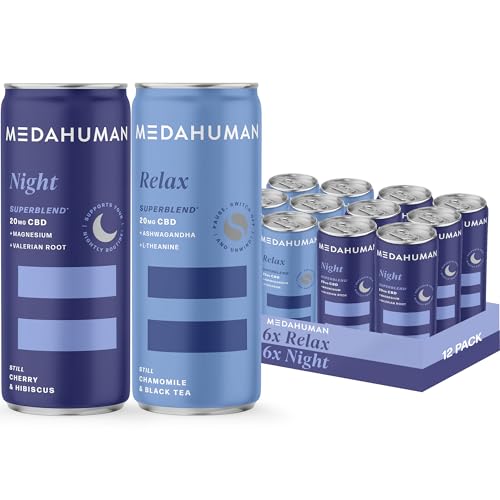 MEDAHUMAN CBD Still Drink Mixed Pack – Night (Sour Cherry & Hibiscus) & Relax (Chamomile & Black Tea) with Ashwagandha, Valerian Root, L-Theanine, Magnesium & D3 | Anxiety Relief Drink – 12 x 250ml