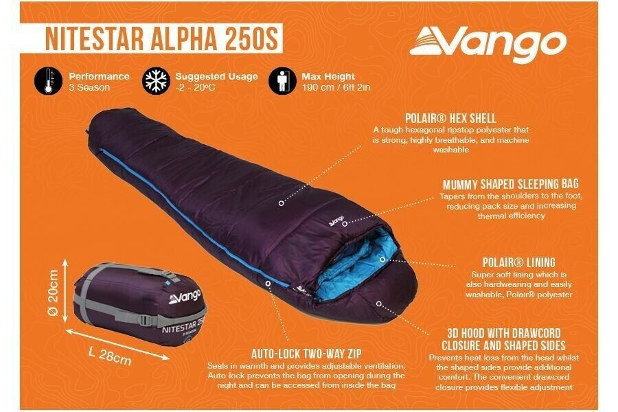 Warm 3 Season Mummy Sleeping Bag-Vango Nitestar Alpha 250S (Short) Trekking Bag