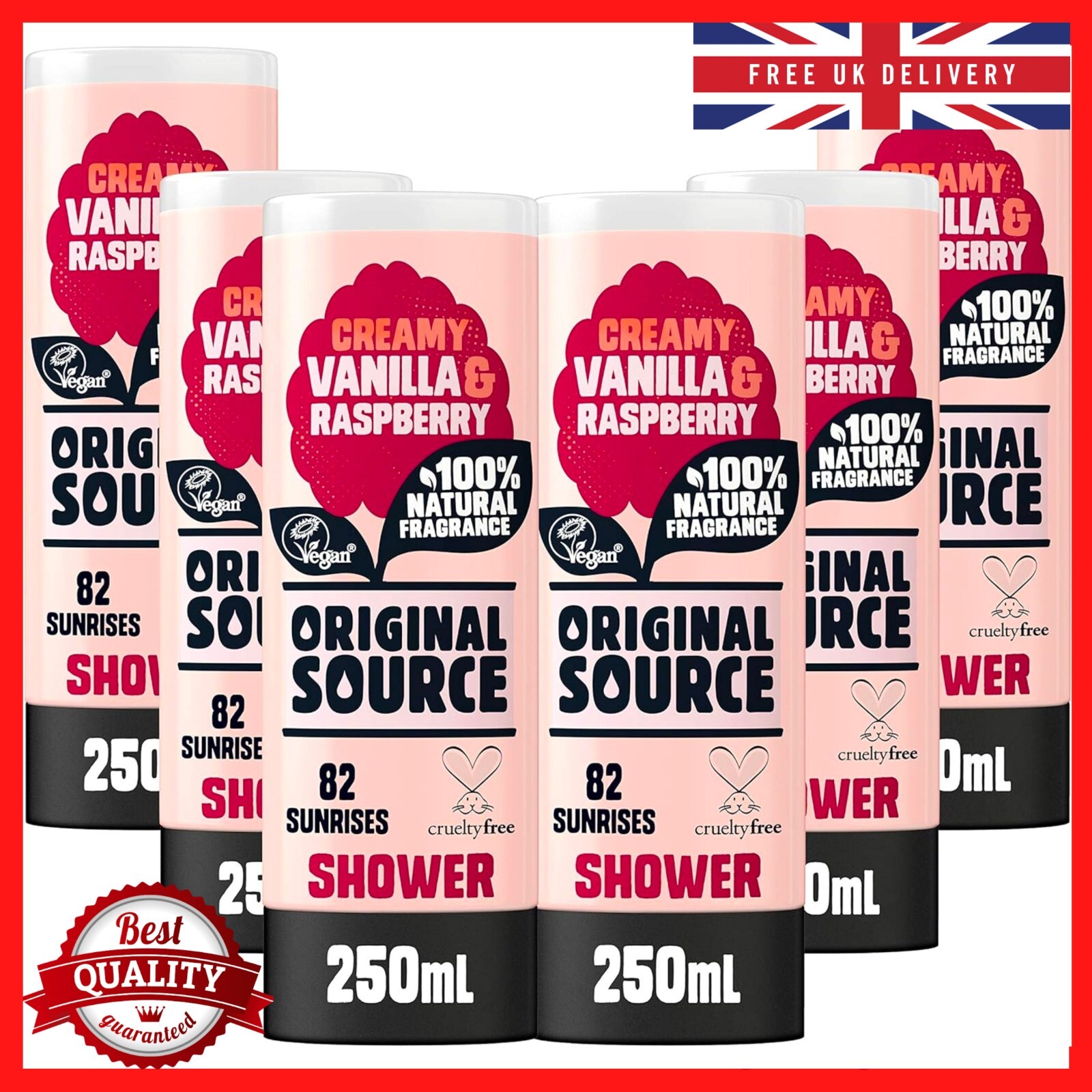 Original Source Vanilla & Raspberry Shower Gel, 100 Percent Natural Fragrance, Vegan, Cruelty Free, Paraben Bulk Buy, Pack of 6 x 250 ml