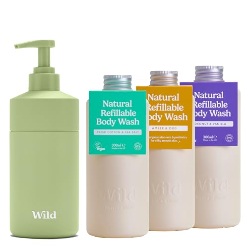 Wild Natural Refillable Body Wash Starter Kit - Includes Sage Green Aluminium Case & 3 Pack Shower Gel Refills in a Variety of Scents - Includes Coconut & Vanilla, Fresh Cotton and Amber & Oud Scents