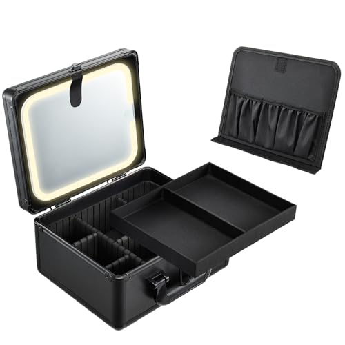 Vanity Case with LED Mirror Makeup Box Removable Light Up Mirror Portable Beauty Case Makeup Artist Carry Vanity Box with Adjustable Dividers and Makeup Brush Holder, Black