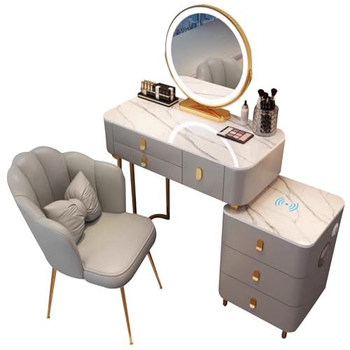 DGPBD Vanity table set with mirror, Bedroom Dresser with upholstered stool and chest of Drawers Makeup Vanity Table Bluetooth Speaker/Glass Table Top/Chair (Make-up table set (grey B))
