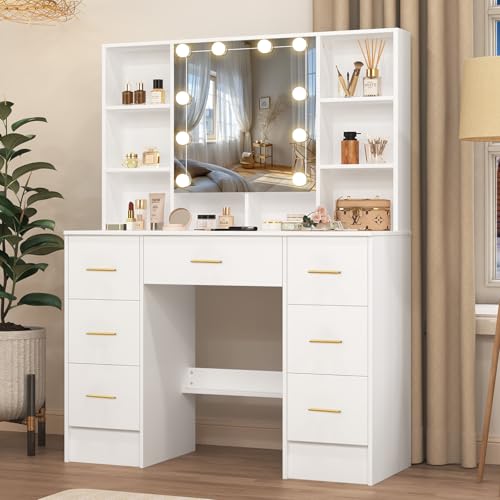 LIANWANG Large Vanity Table, White Vanity Set with Mirror and Lights, 7 Drawers 8 Shelve Makeup Desk with Metal Handles for Girls and Women, White