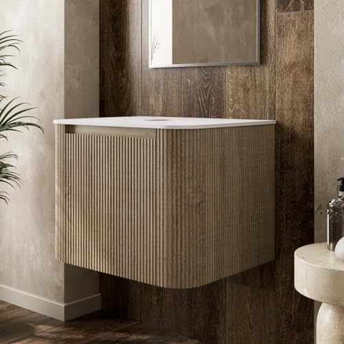 BAYSTONE® Deku 600mm Fluted Countertop Bathroom Vanity Unit Wall Hung Storage Furniture Cloakroom, Soft Close Drawer, Oak Wood Effect, No Basin