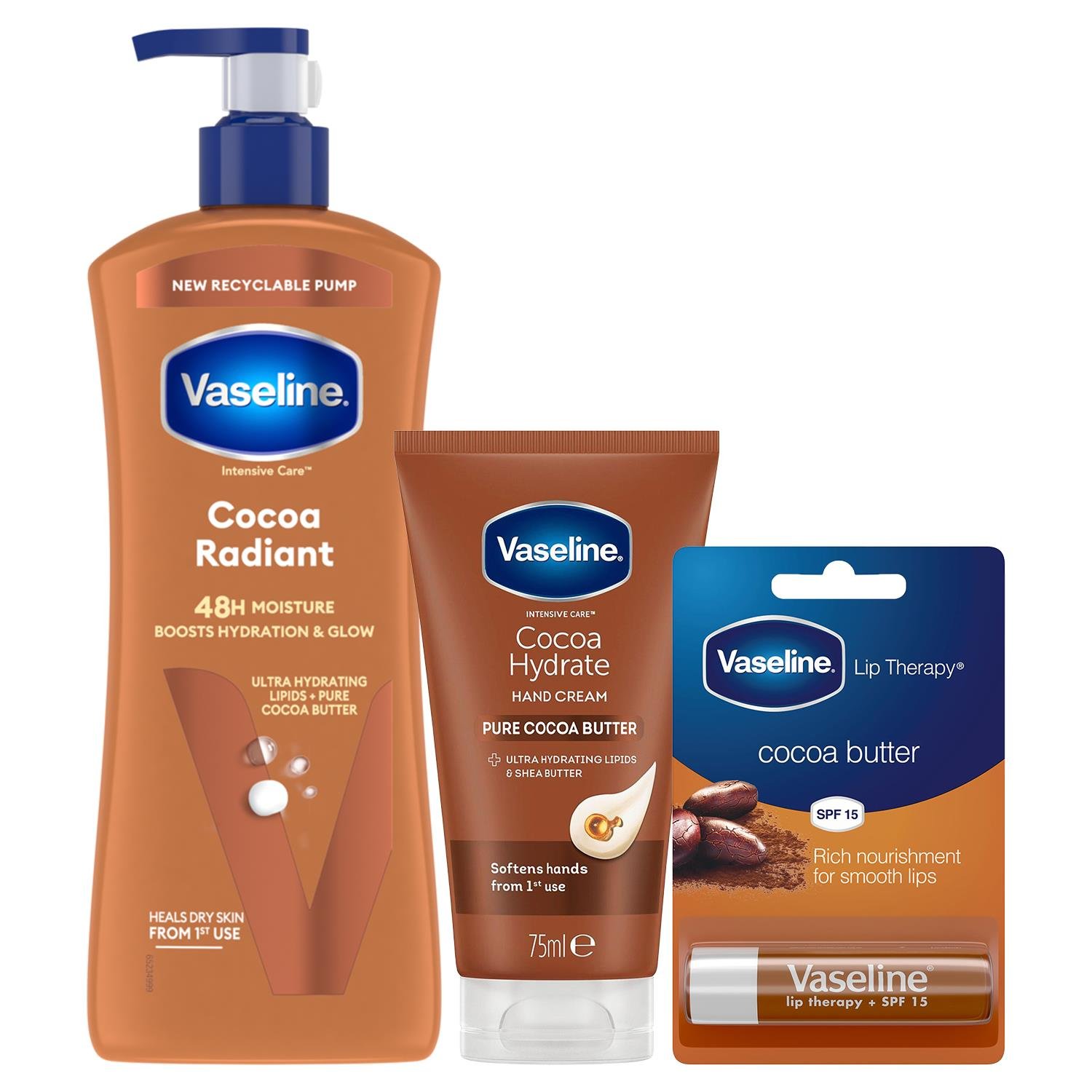 Vaseline Cocoa Radiant Bundle Body Lotion 600ml Hand Cream 75ml Lip Therapy 4gm
