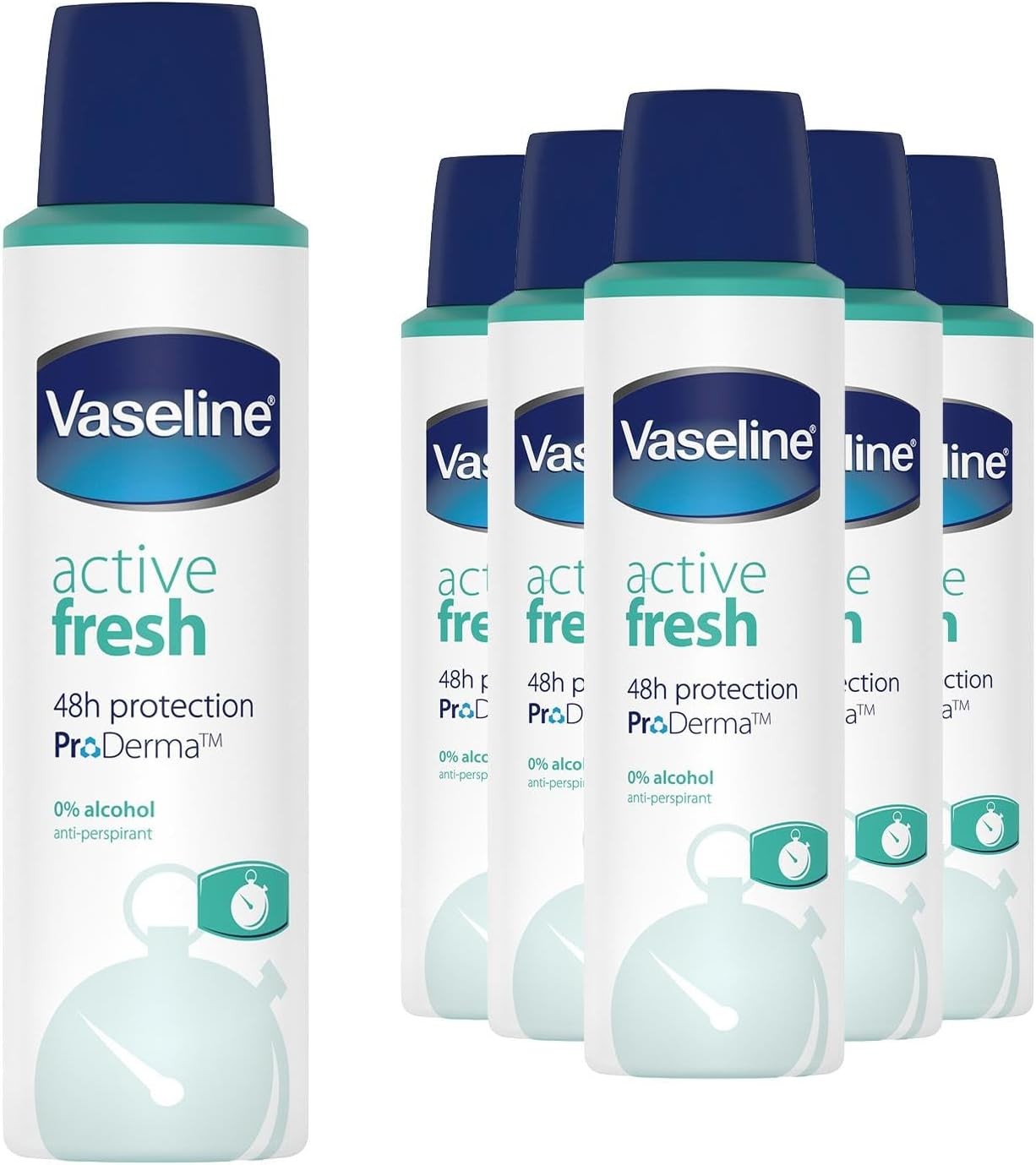 Vaseline Active Fresh Skin Care Antiperspirant Deodorant with ProDerma Technology for 24H Protection with 0% Alcohol 150 ml Pack of 6