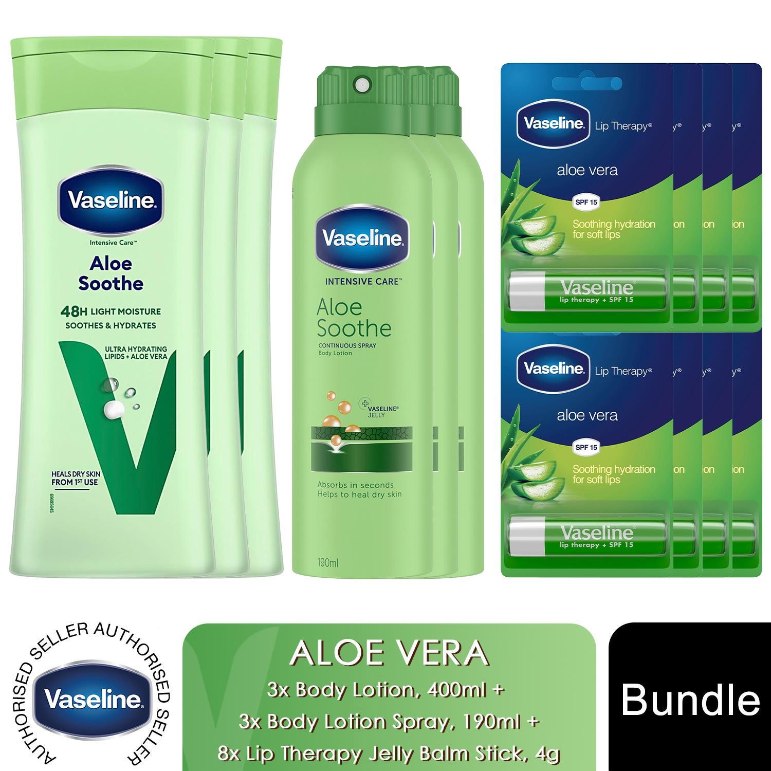 Vaseline Aloe Bundle Lip Therapy 4g, Spray Body Lotion 190ml & Body Lotion 400ml