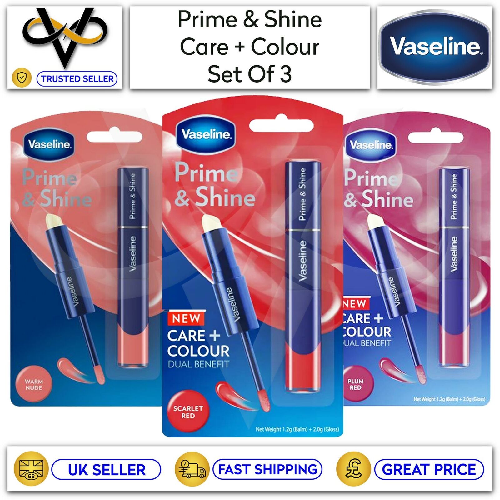 Set of 3 Vaseline Prime & Shine Care & Colour Dual Benefit Lip Balm & Gloss