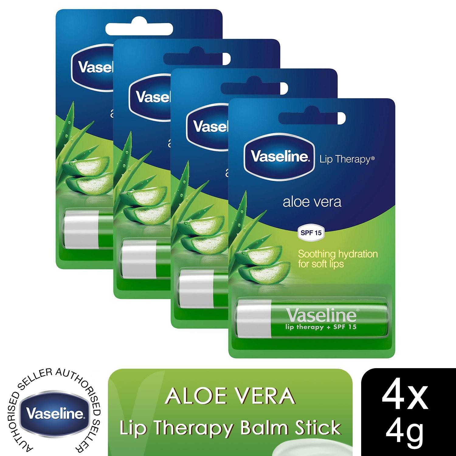Vaseline Lip Therapy With Petroleum Jelly Balm Sticks, Aloe Vera, 4 Pack, 4gm