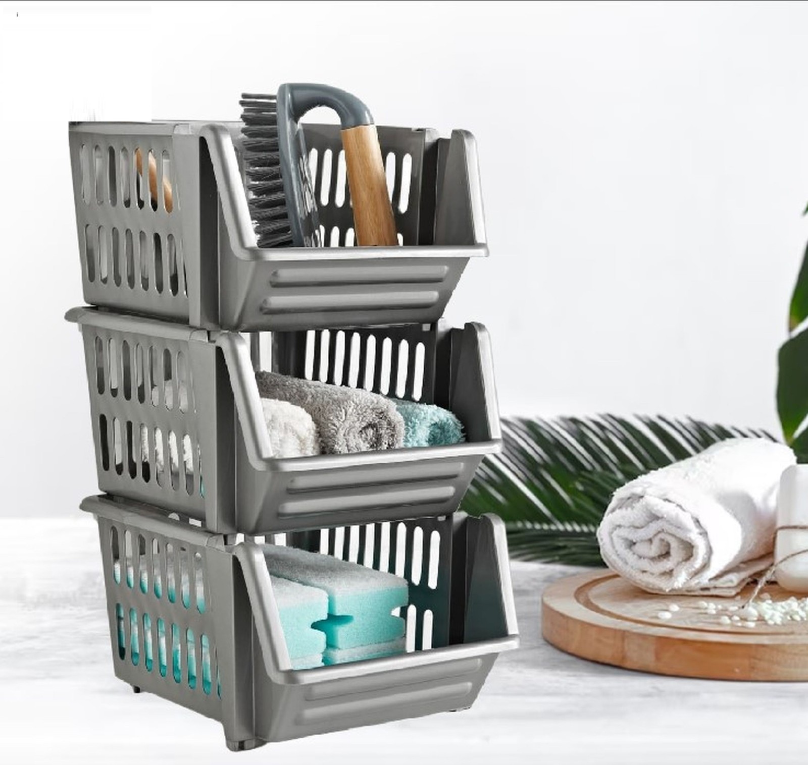 AGP ADVANCED GLOBAL PRODUCTIONS 3 or 4 Tier Stacking Baskets Storage Veg Rack Plastic Stackers, Plastic Kitchen Utility Basket, Use in Bathroom, Home, Office (Grey 3 Tier)