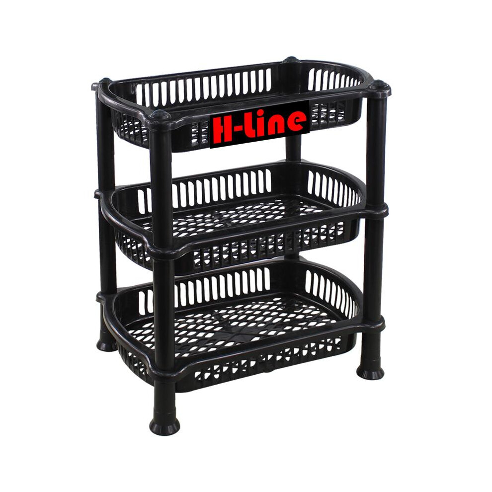 (3 Tier Black) H-line 3 Tier 4 Tier Black Plastic Storage Shelf Shelves Basket Veg Fruit Rack Caddy Home Kitchen Bathroom Office Organiser Lightweight