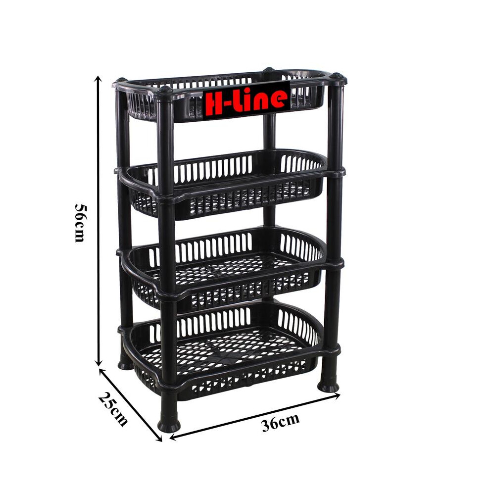 (4 Tier Black) H-line 3 Tier 4 Tier Black Plastic Storage Shelf Shelves Basket Veg Fruit Rack Caddy Home Kitchen Bathroom Office Organiser Lightweight