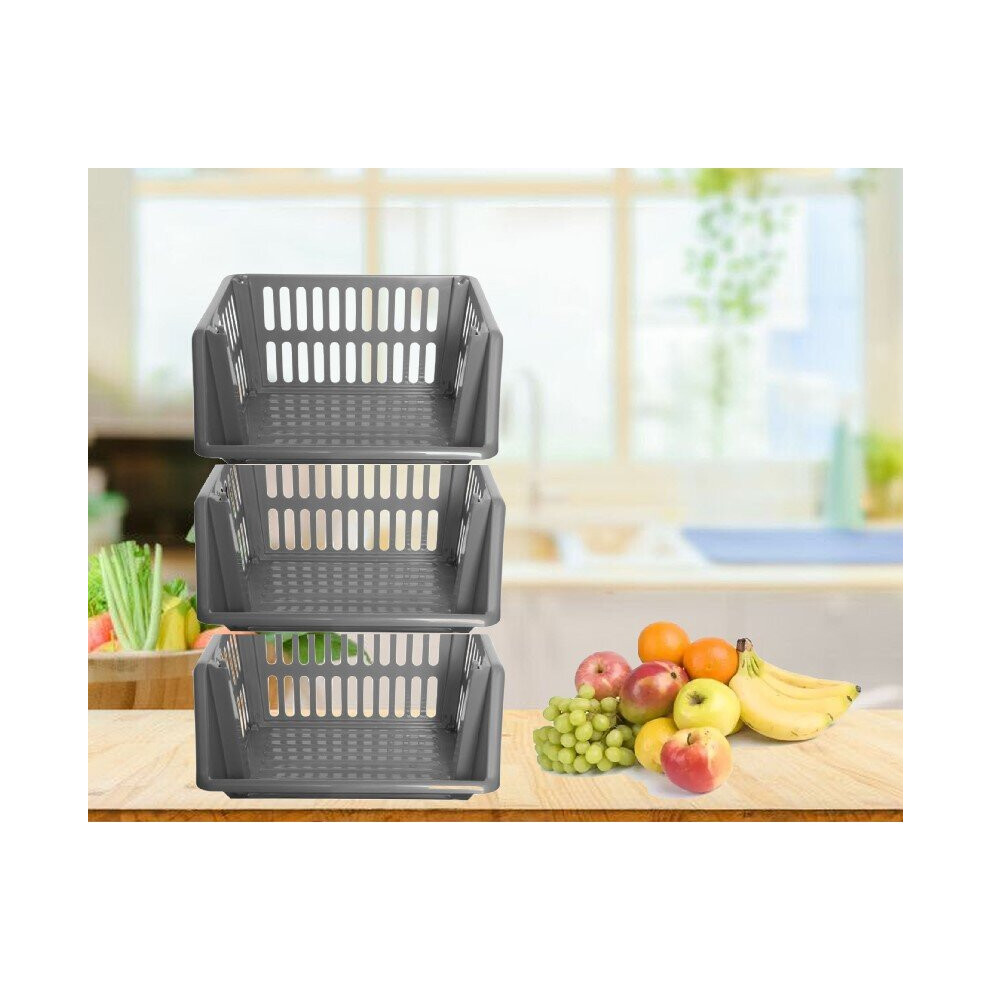 Large 3 Tier Stacking Baskets Storage Veg Rack Plastic Stackers 35cm - Silver