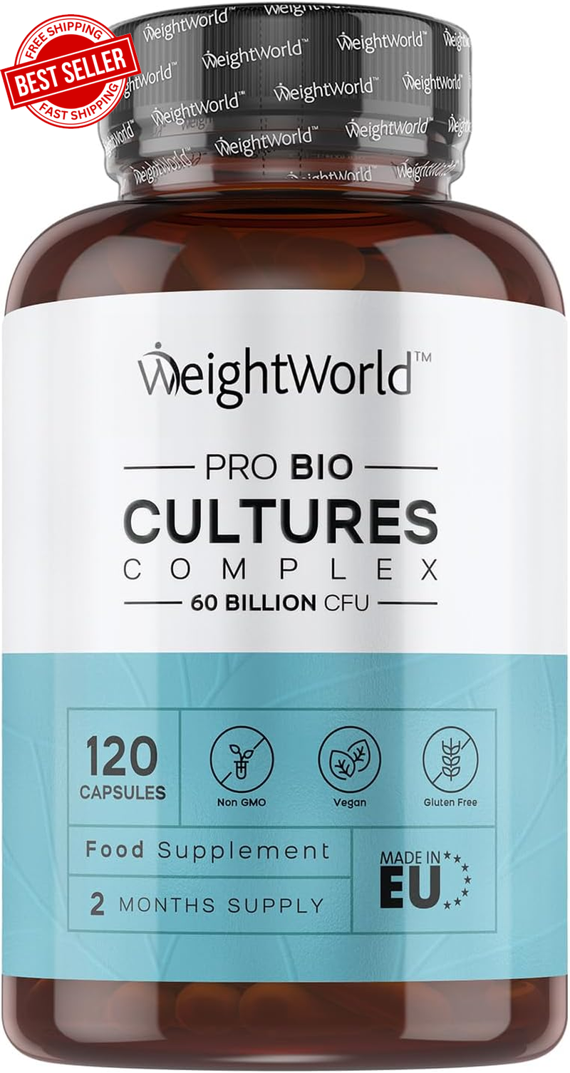 Bio Cultures Complex Probiotics & Prebiotics - 60 Billion CFU - 2 Months Supply - 120 Capsules - 20 Live Bio Cultures - Lactobacillus & Bifidobacterium Strains - Vegan Probiotic Complex Capsules