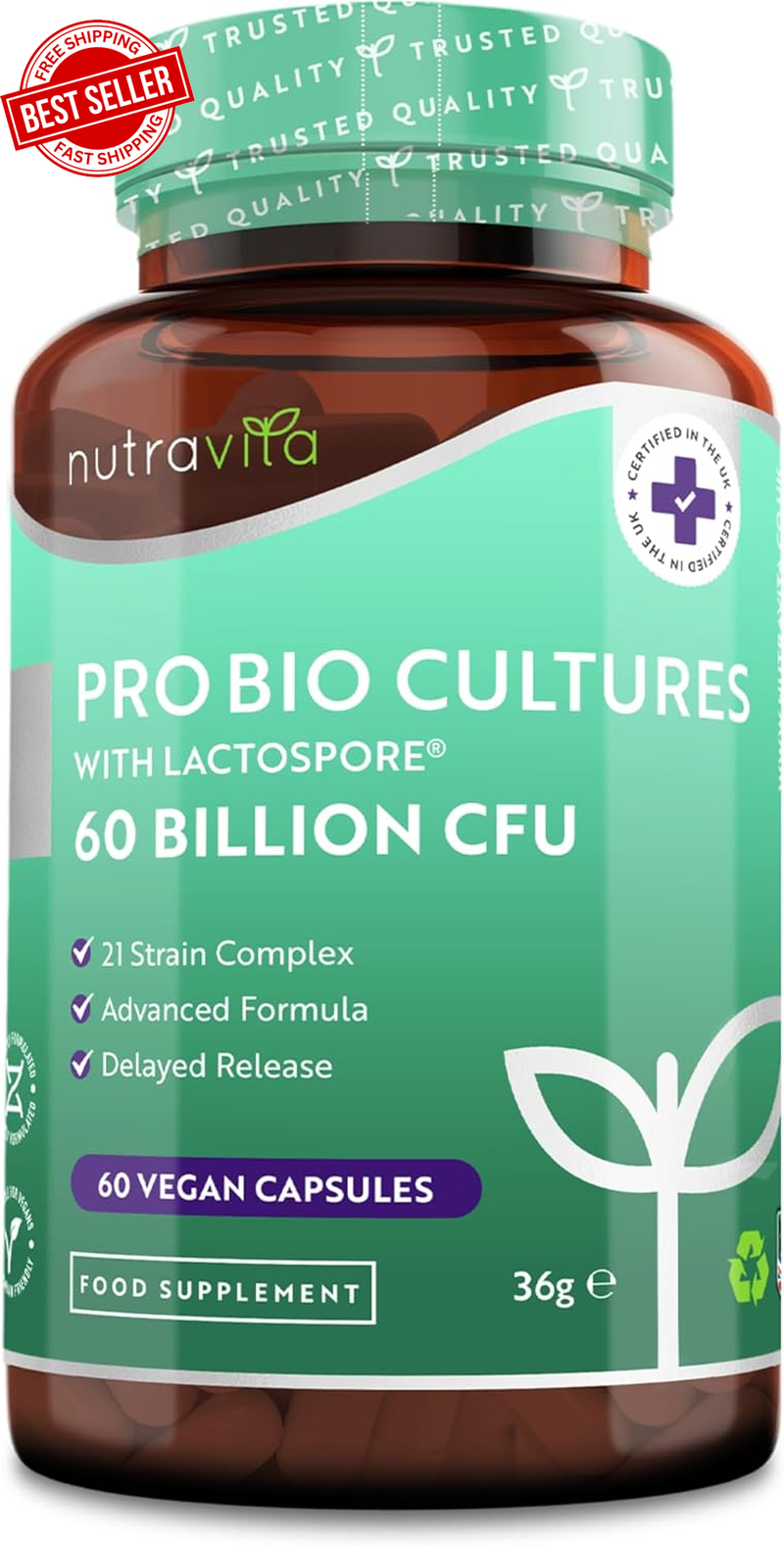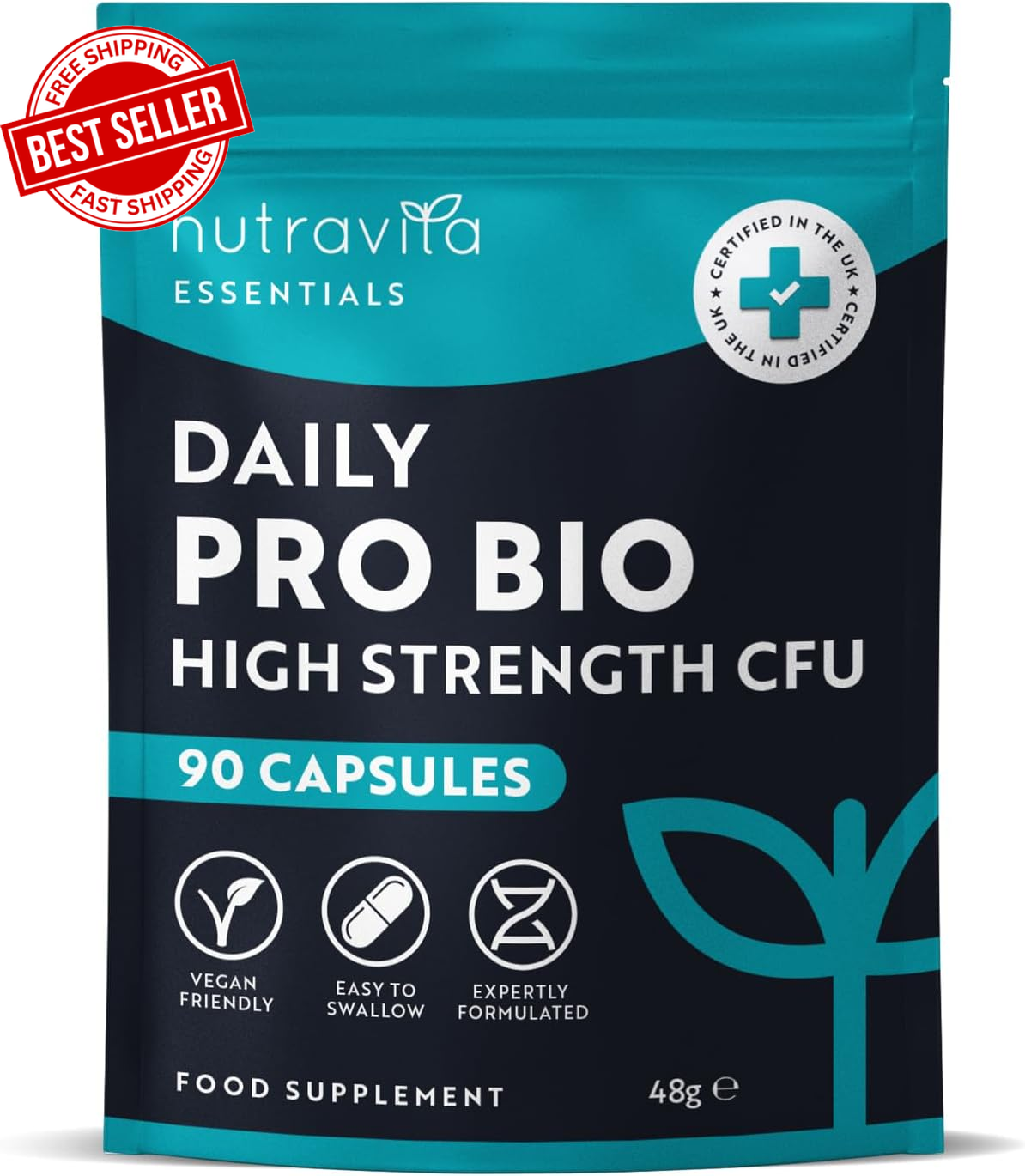 Probiotics for Gut Health - 90 Vegan Capsules (Not Tablets) for Bloating Relief - Supplements for Men & Women - Bio Cultures Complex with Lactobacillus Acidophilus - Nutravita