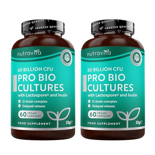 Nutravita 60 Billion CFU Probiotic Cultures, Scientifically Backed Lactospore®, 2 Packs of 60 Vegan Capsules, Enteric Coating to Ensure Probiotics are Delivered Directly to The Gut, Made in The UK
