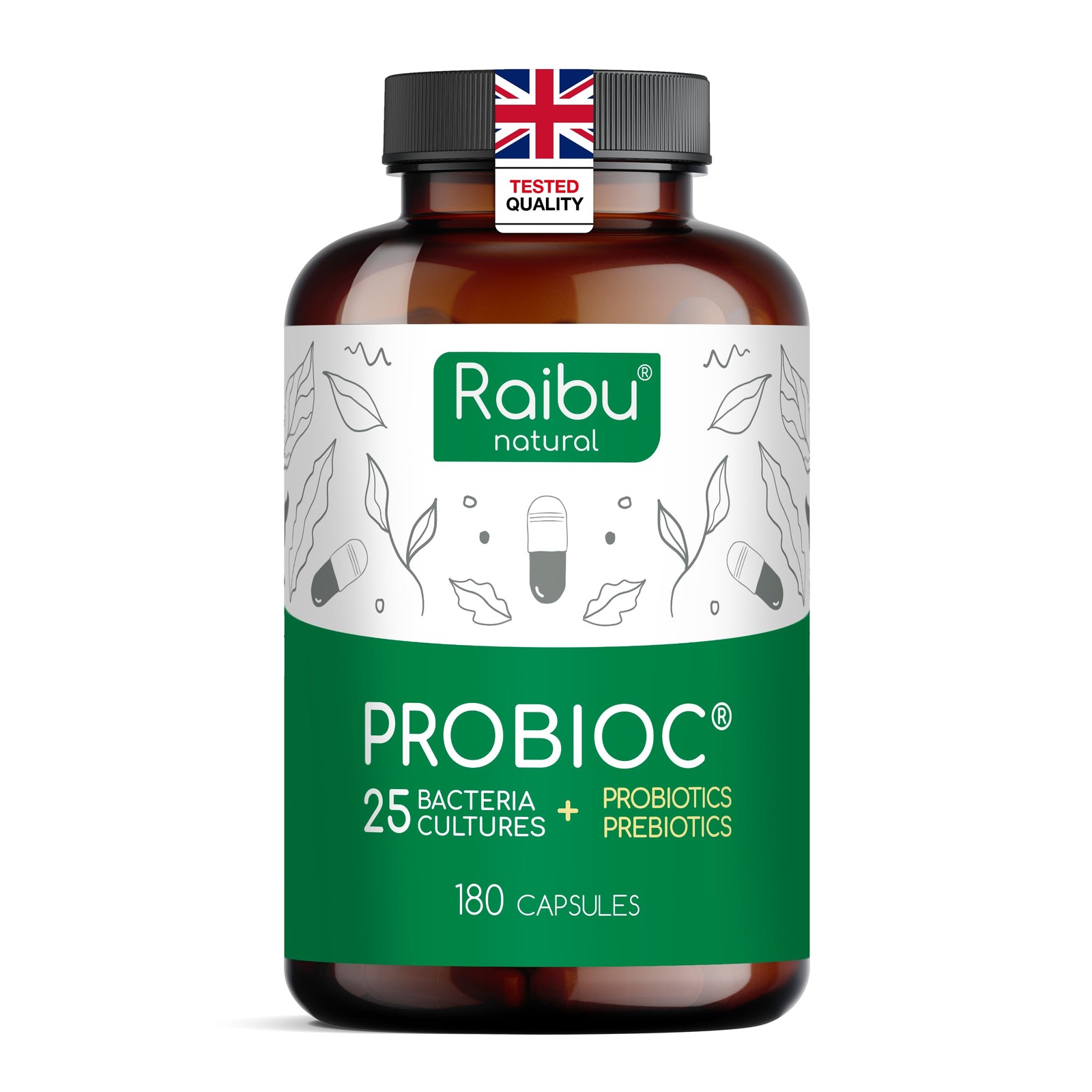 Raibu Probiotics for Gut Health with 25 Cultures, 60 Billion CFU, 180 Vegan Caps