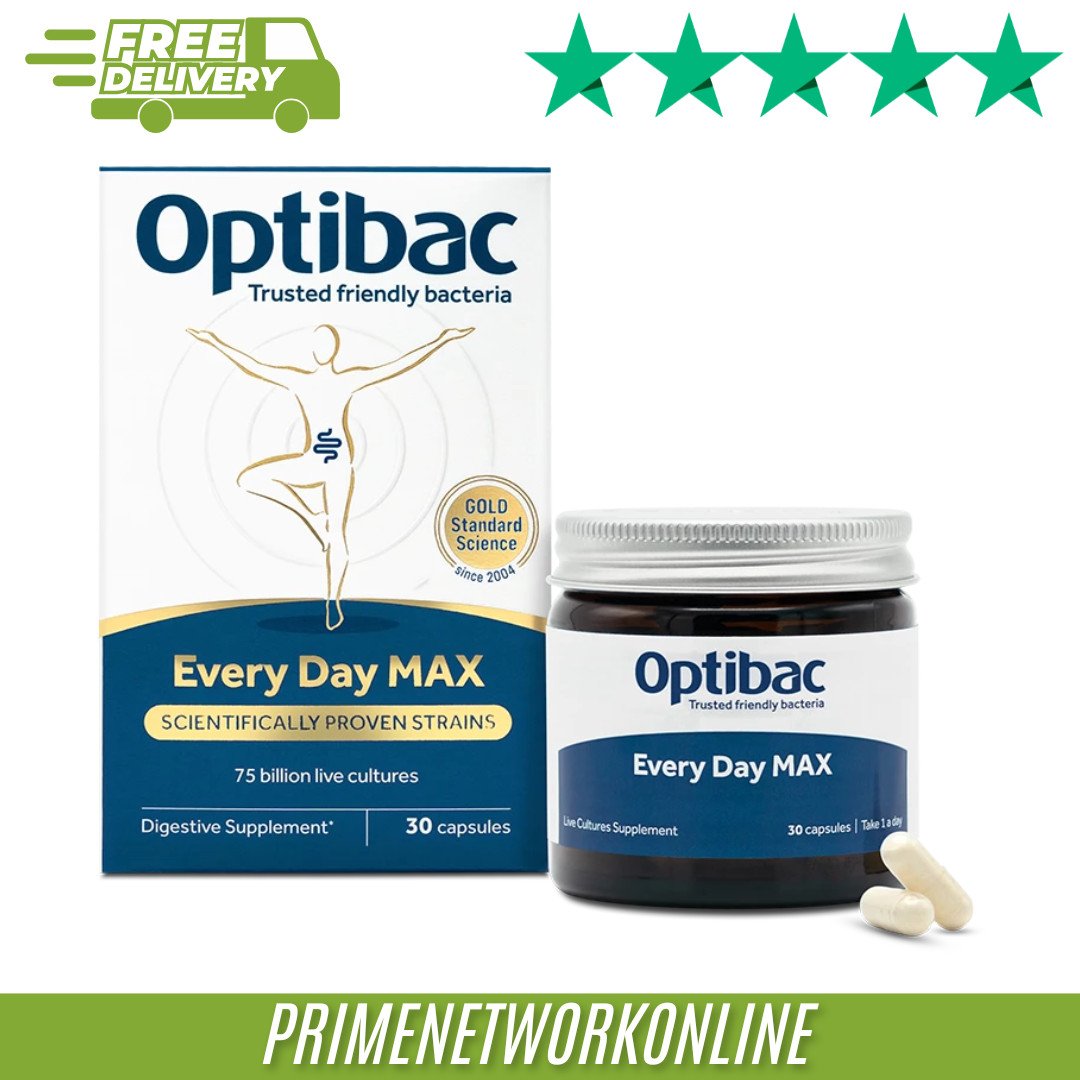 Optibac Probiotics Every Day MAX - Advanced Maximum Strength Vegan Digestive Probiotic Supplement with 75 Billion Bacterial Cultures - 30 Capsules