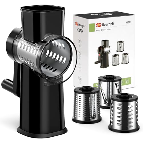 Ibergrif Rotary Cheese Grater with Suction Base – Manual Vegetable Slicer Mandoline, 3 Blades for Slicing, Shredding and Grating, BPA Free, Black