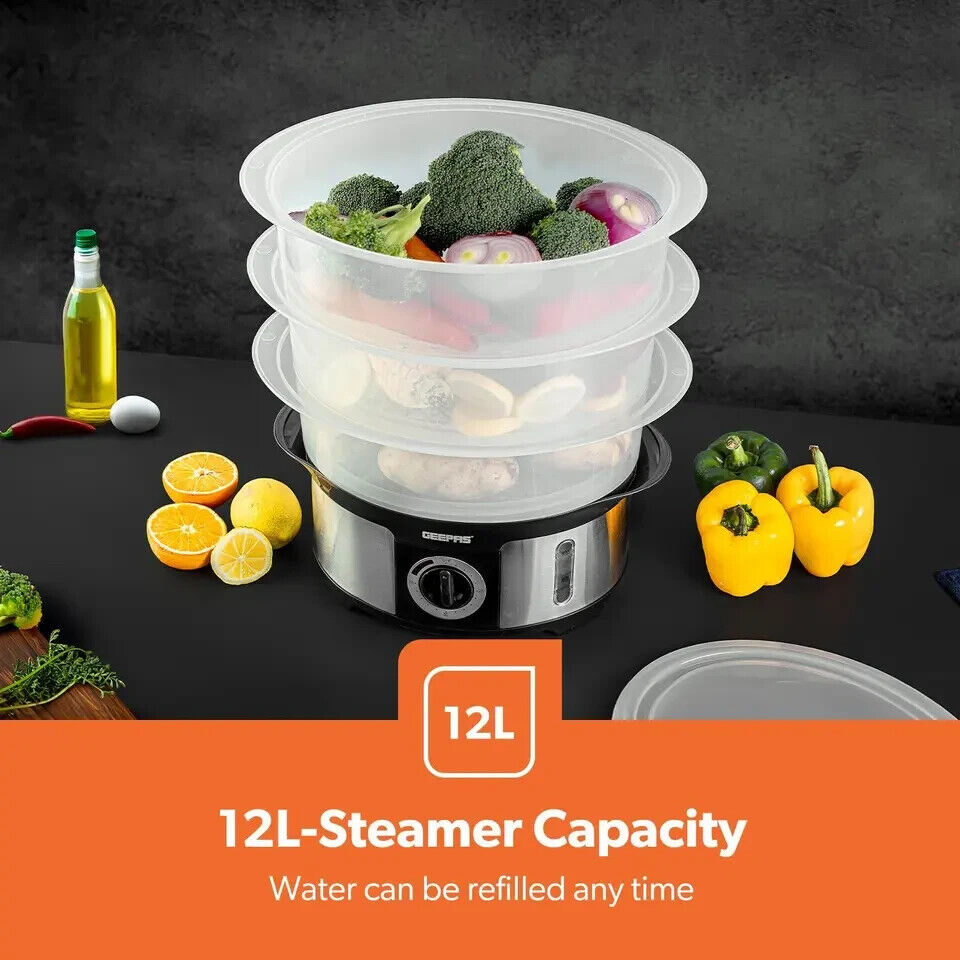 Geepas 3-Tier Food Steamer, 12L Capacity | Electric Vegetable Steamer with BPA Free Removable Baskets For Healthy Steam Cooking | 75 Minutes Timer & 1000W Power | Stainless Steel Housing
