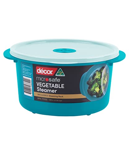 Décor Microsafe Vegetable Steamer designed for quick microwave heating and cooking. Steam meat, fish and vegetables in minutes Dishwasher & Freezer Safe BPA Free 1.5L Capacity - Teal