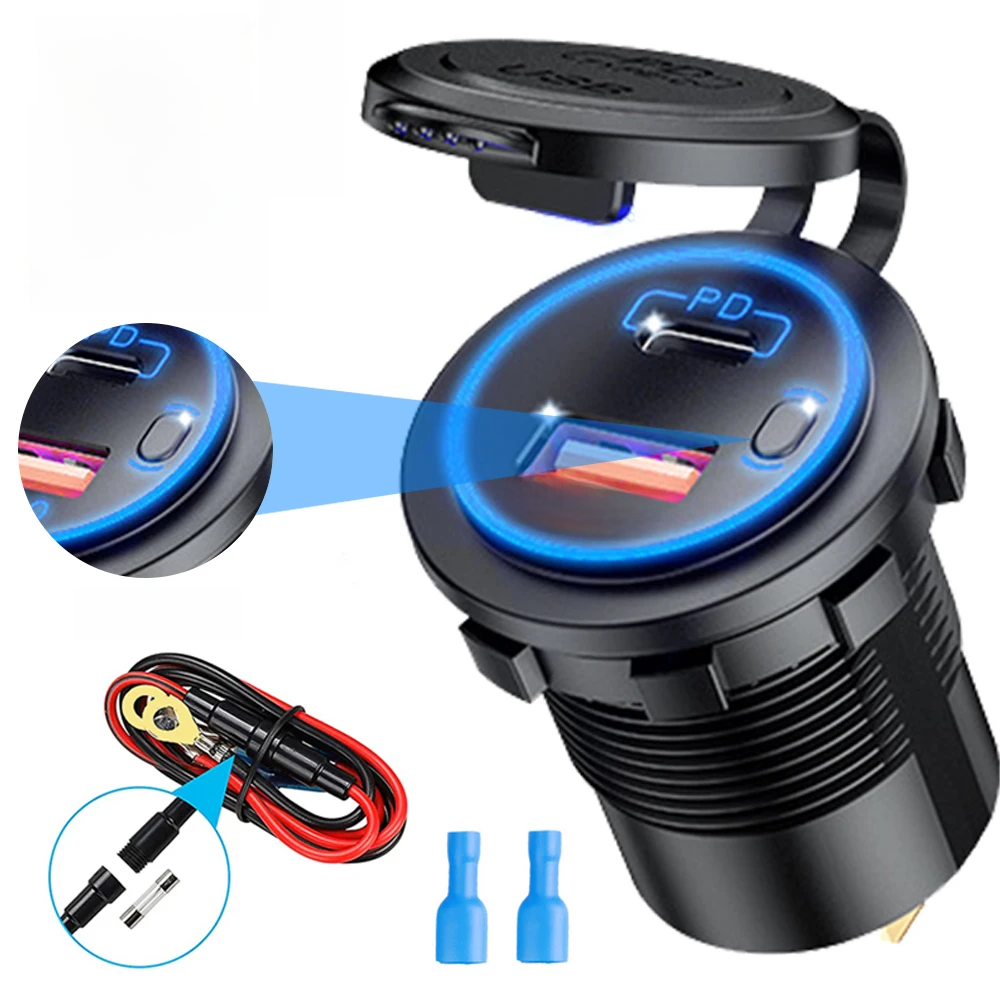 60W Quick Charge Car Charger QC3.0 USB+PD Type C Port Cigarette Lighter Socket Voltmeter Auto Power Adapter for 12V/24V Vehicle