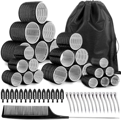 PandyCare Hair Rollers Set 40 PCS, Hair Roller For Long & Short Hair, Velcro Hair rollers, Rollers hair curlers with 18 Self Grip Black Rollers, 16 Hair Clips, 1 Rat Tail Combs&Waterproof storage bag