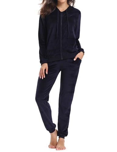 Aottori Velour Tracksuit Womens Full Set Velvet Pajamas 2 Piece Loungewear Zip Up Hoodie Sweatpants Casual Outfits Autumn Winter Navy Blue M