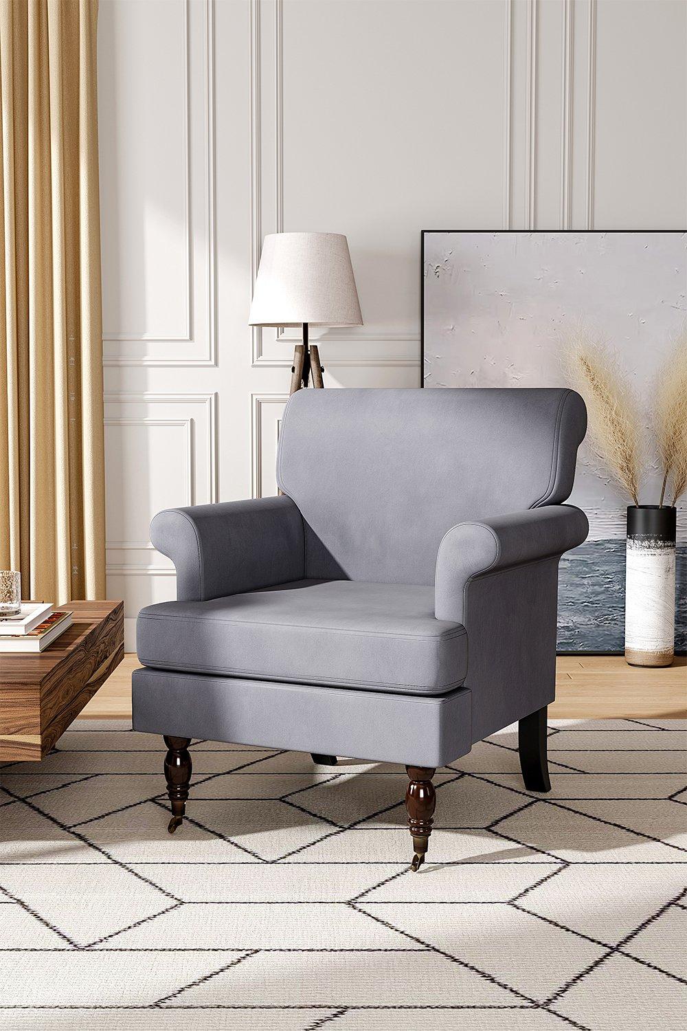 Grey Contemporary Velvet Armchair with Wood Legs and Front Casters