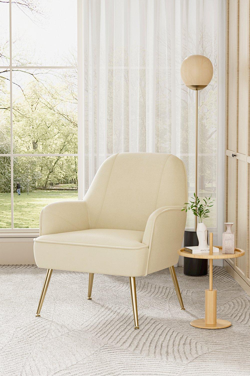 White Warp-Knitted Velvet Upholstered Armchair with Gold Metal Legs