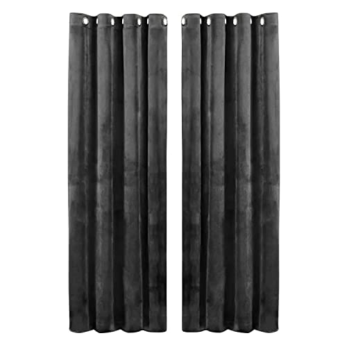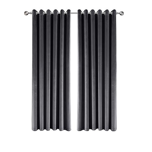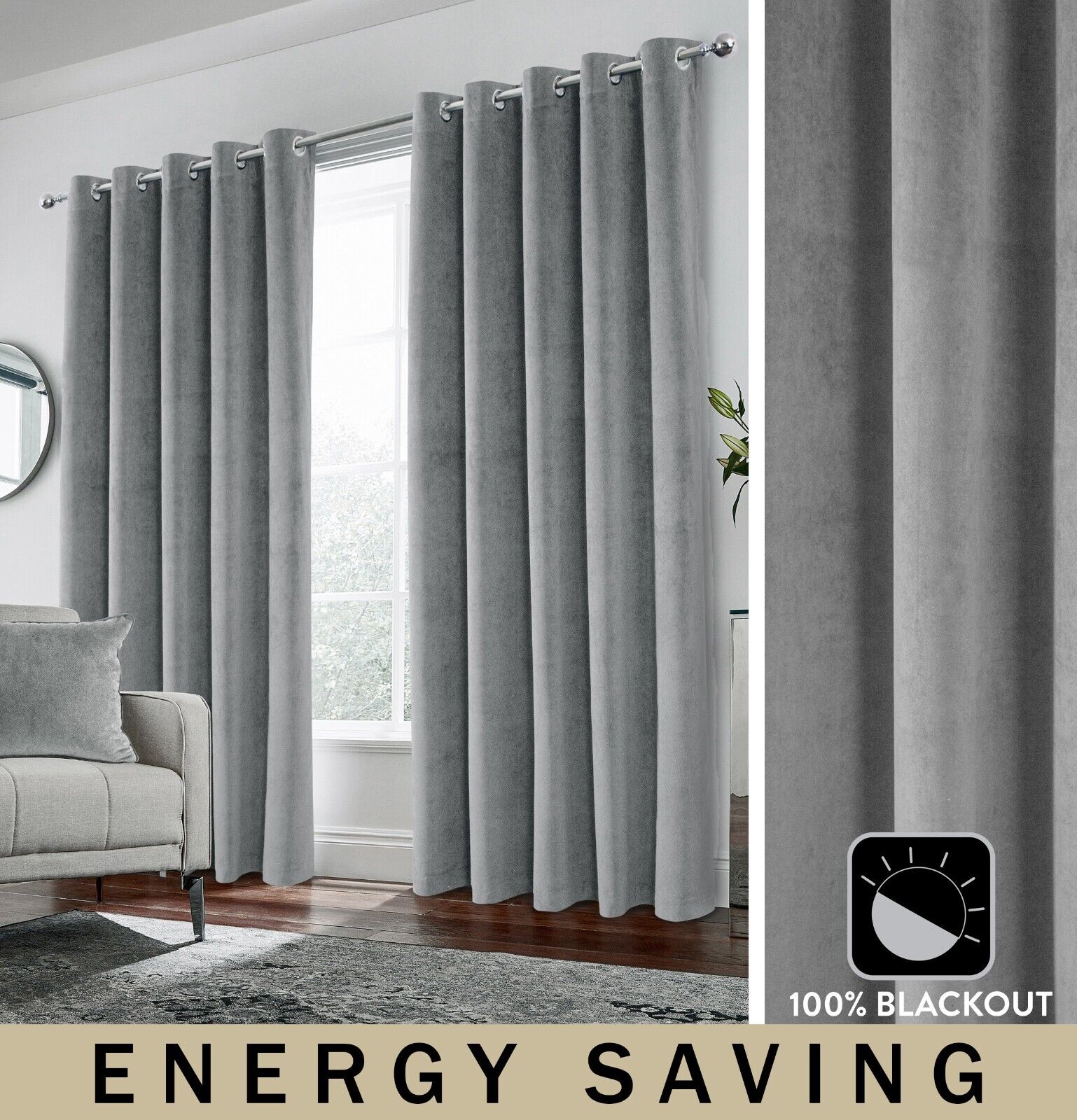 Grey Velvet 100% Blackout Pair of Curtains Eyelet Top - 90 x 90 inch (229x229cm)