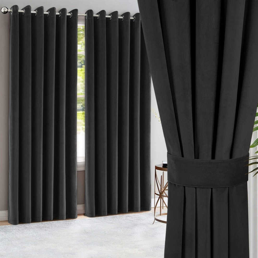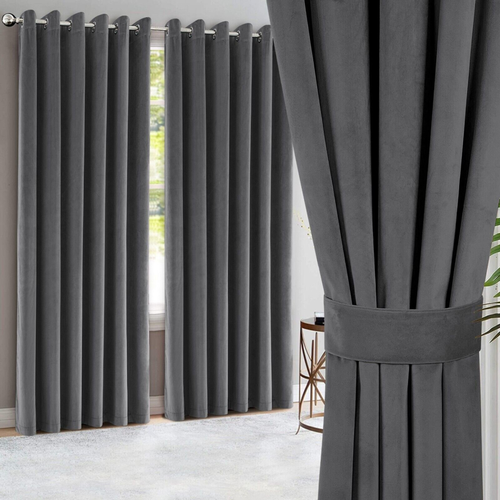 Oxford Homeware Charcoal Blackout Curtains 90x90 for Bedroom – Crushed Velvet Eyelet Curtains Thermal Insulated + 2 Tie Backs (228cm x 228cm)