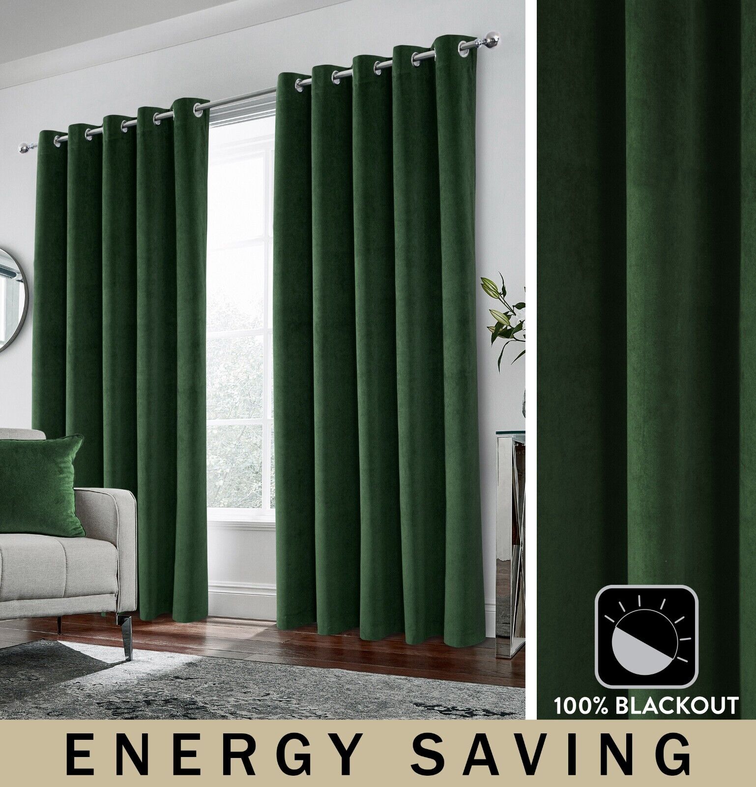 Green Velvet 100% Blackout Pair of Curtains Eyelet Top - 90x90 inch (229x229cm)